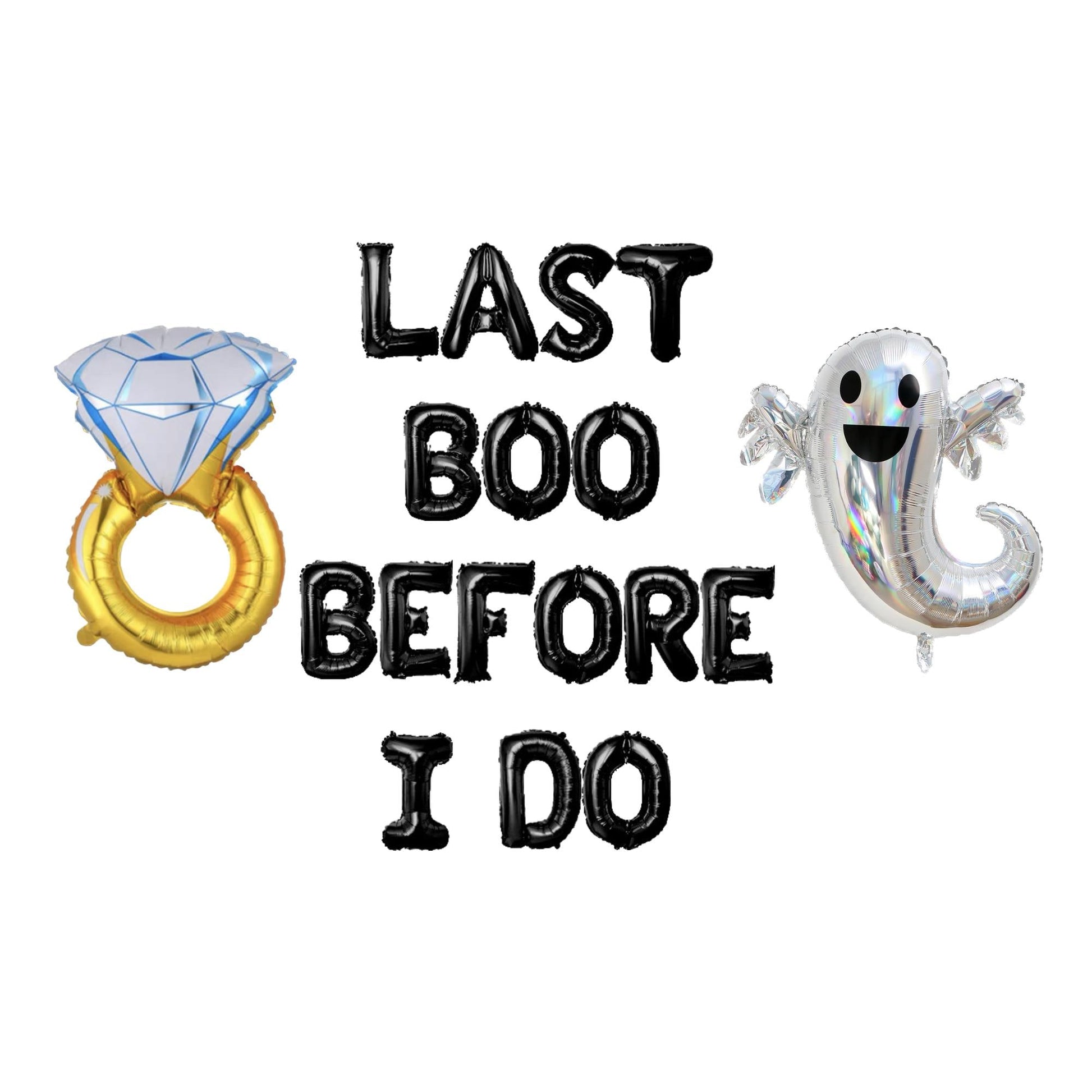 Halloween Bachelorette Balloon Banner - 'Last Boo Before I Do' with Silver BOO & Diamond Ring Balloons - Spooky Bridal Party Decor or Gift